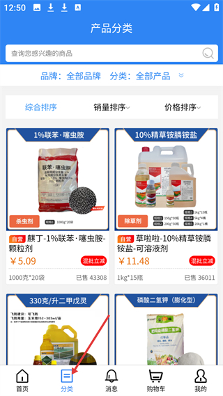 2、分類板塊,呈現產品分類界面,可按品牌、分類篩選,展示殺蟲劑、除草劑等農資產品,標注價格、銷量及規格信息。
