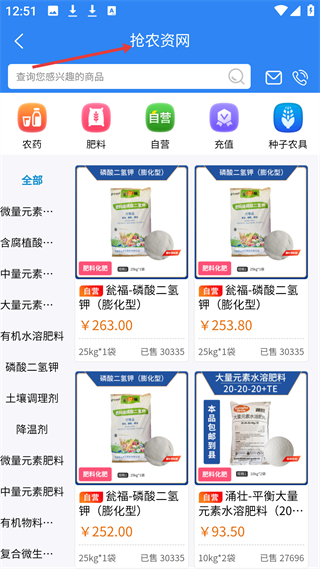 3、肥料板塊,屬于搶農資網分類下,展示磷酸二氫鉀、大量元素水溶肥料等肥料產品,標注價格、銷量及規格信息,可按肥料類型篩選。