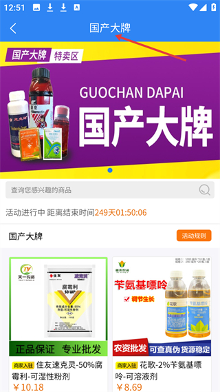 4、國產大牌板塊,開展國產大牌特賣活動,展示腐霉利、芐氨基嘌呤等農資產品,標注價格及產品信息,活動有明確結束時間。