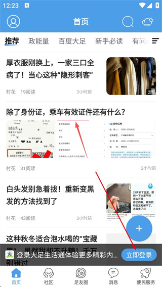 1、進入大足生活通app首頁,瀏覽推薦的資訊內容,點擊立即登錄按鈕,進入賬號登錄的操作頁面。