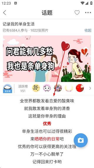 3、進入話題頁面查看記錄我的單身生活等話題內容,瀏覽話題下的動態信息,了解其他用戶的分享。
