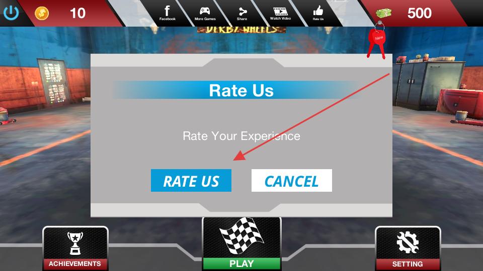 1、進入游戲看到評分提示界面,根據自身選擇,點擊相應按鈕,關閉評分提示,進入游戲主界面準備開始賽車碰撞競技。