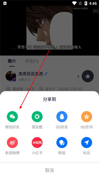 3、在作品播放頁面找到分享按鈕,點擊該按鈕彈出分享選項菜單,查看可分享的渠道類型。