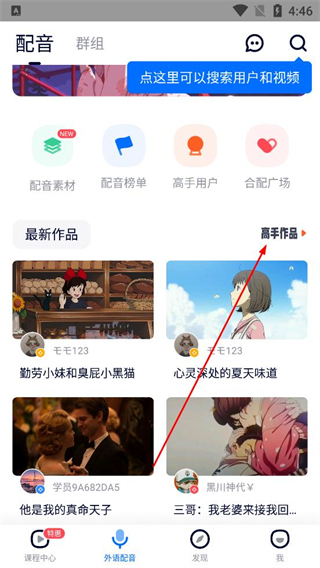 1、打開配音軟件進入發現頁面,找到高手作品選項,點擊進入高手作品列表頁面,查看各類配音作品。
