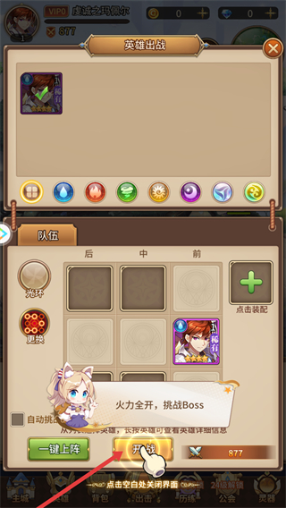 2、進入英雄出戰界面,可進行一鍵上陣或手動搭配英雄,布置好隊伍后點擊開戰,開啟挑戰BOSS的戰斗。
