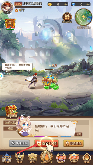 1、在游戲主界面可點擊挑戰BOSS按鈕,進入戰斗準備環節,同時可領取掛機獎勵,快速提升角色戰力。