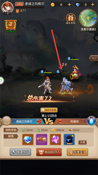 3、英雄會自動攻擊敵人,可看到總傷害數值,在多回合對戰,持續攻擊敵人,推進戰斗進程。