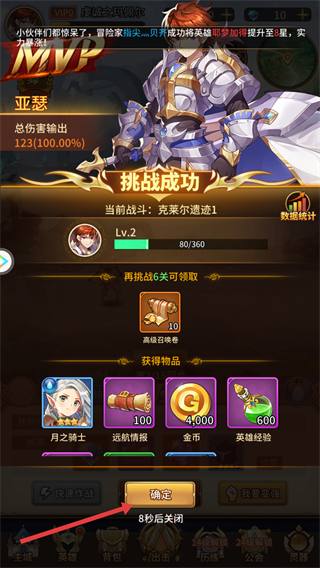 4、挑戰成功后會顯示挑戰成功界面,獲得英雄經驗、金幣等物品,點擊確定可繼續游戲,開啟新的挑戰。