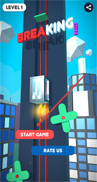 1、玩家點擊START GAME按鈕開啟游戲,控制電梯下落避開綠色障礙物,讓電梯安全抵達底部。