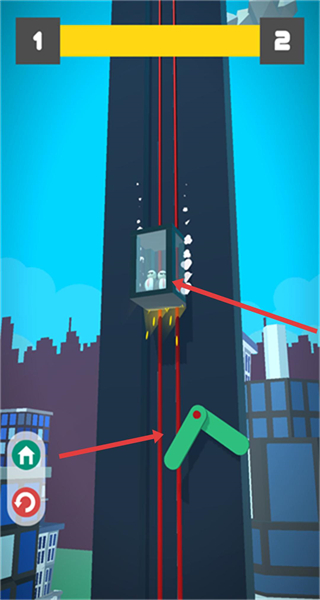 3、玩家在控制電梯下落時,遇綠色轉動障礙物需把握時機及時緩降,在其旋轉到不阻擋位置時快速通過。