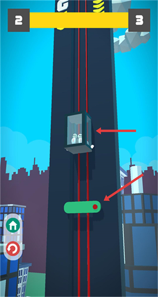 4、玩家在面對綠色橫放隔板障礙物時,要精準判斷電梯下落節奏,在障礙物移開通道時迅速下落通過。