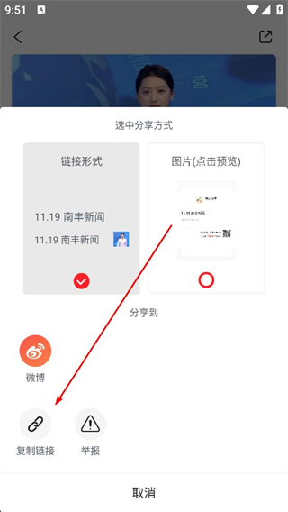 4、在分享界面選擇鏈接形式,再選擇微博渠道分享該新聞,也可復制鏈接,完成操作后點擊取消關閉分享彈窗。