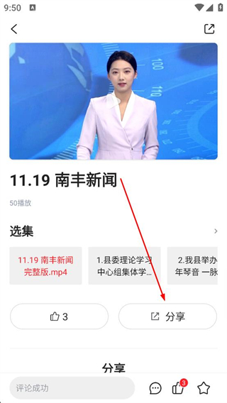 3、在南豐新聞詳情頁,查看新聞視頻內容,可點擊點贊按鈕互動,再點擊分享按鈕進入分享方式選擇界面。