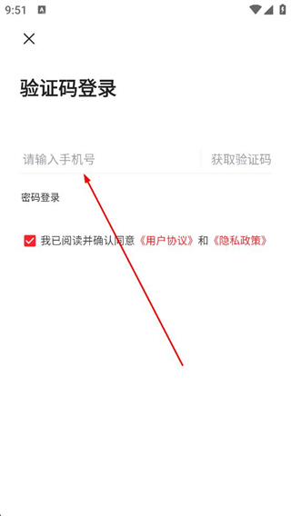 1、打開軟件進入驗證登錄頁面,選擇驗證碼登錄方式,輸入手機號,勾選用戶協議和隱私政策,準備獲取驗證碼完成登錄。