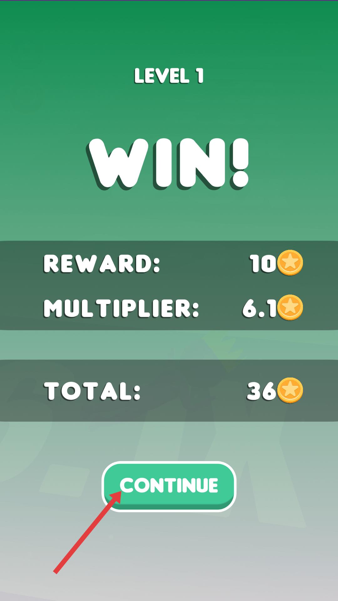 4、成功完成關卡后,界面會顯示WIN,此時點擊CONTINUE按鈕,就能進入下一關,繼續新的挑戰,還能獲得金幣等獎勵。
