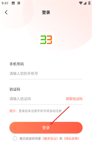 1、進入界面看到登錄頁面,頁面含手機號碼驗證碼輸入框及登錄按鈕,需先勾選同意協議,填好信息后點擊登錄,就能進入后續功能界面。