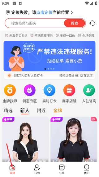 2、首頁有特惠專區等功能入口,可搜索技師與服務,享受未服務實時退等保障,便捷體驗。