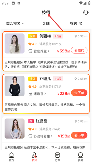 3、進入技師頁面看到綜合排名等分類,列表展示技師信息含評分服務次數及價格,每個技師旁有預約按鈕,可按需選技師點對應按鈕。