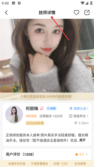 4、選擇技師后進入詳情頁面,頁面展示技師經驗服務次數及服務介紹,還能查看用戶評價,可在此了解技師信息并進行后續操作。