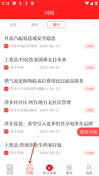 2、問政幫忙分類展示井蓋隱患、飲水困難、燃氣表費用等問政內容,用戶可參與問政及時解決各類生活難題。