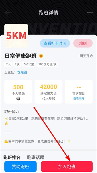 4、進入跑班詳情頁面,可查看跑班的時長、距離等信息及簡介,點擊加入跑班按鈕,即可參與該跑班的跑步活動,培養跑步習慣。