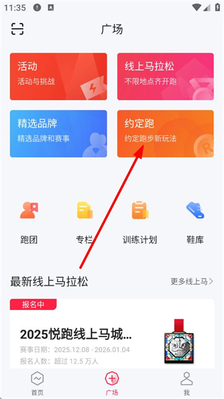 2、廣場頁面,有活動、線上馬拉松等板塊,還有跑團、專欄等功能入口,點擊約定跑選項,可進入對應的跑班參與或創建跑步活動。