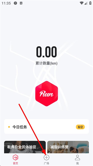 1、進入悅跑圈首頁,可查看累計跑量及今日任務進度,點擊底部廣場按鈕,可進入廣場頁面參與各類跑步相關活動與互動。