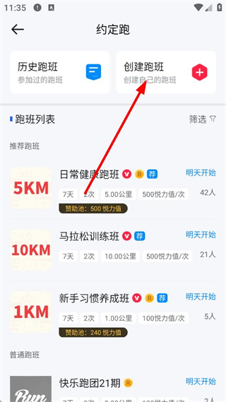3、進入約定跑頁面,可查看歷史跑班及跑班列表,包含不同距離和規則的推薦跑班,點擊創建跑班按鈕,能創建屬于自己的跑班。