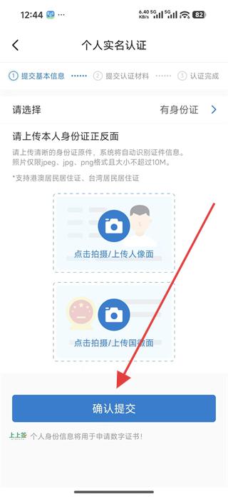 3、在個人實名認證頁面,上傳本人身份證正反面,點擊確認提交,完成實名認證。
