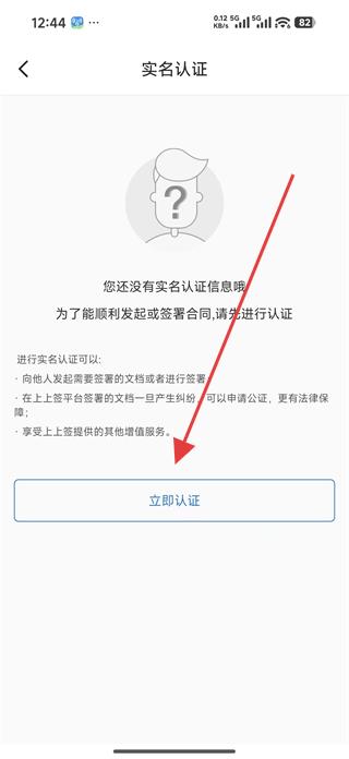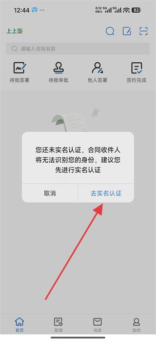 1、打開上上簽APP,若未實名認證,會彈出提示框,點擊去實名認證,進入實名認證頁面。
