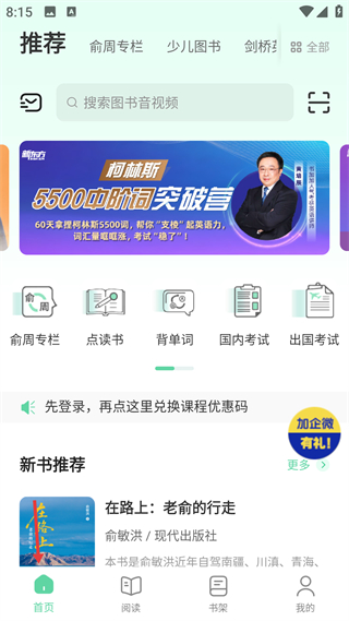 1、首頁用搜索找圖書音視頻,有俞周專欄等功能入口,新書推薦展書籍信息,登錄后可兌課程優惠碼,助力學習資源獲取。
