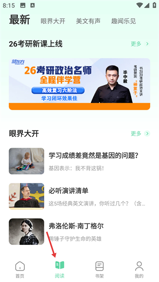 2、閱讀頁看最新內容,含考研新課、眼界大開類文章,不同分類有對應內容,按需選讀,豐富知識儲備與學習素材。