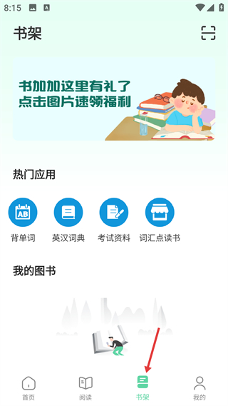 3、書架頁有熱門應用板塊,含背單詞等工具,我的圖書管已獲圖書,點擊圖片領福利,輔助學習工具的使用。