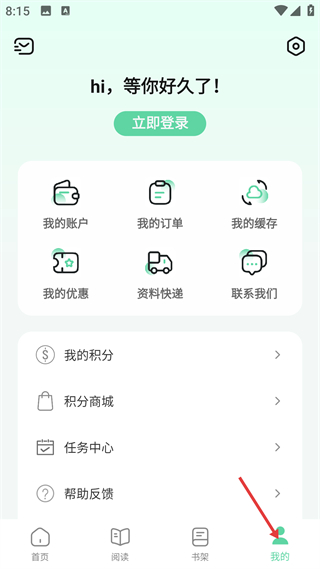 4、我的頁需先登錄,登錄后用賬戶、訂單等功能,有積分等權益板塊,可進行資料快遞、聯系客服,管理個人學習事務。