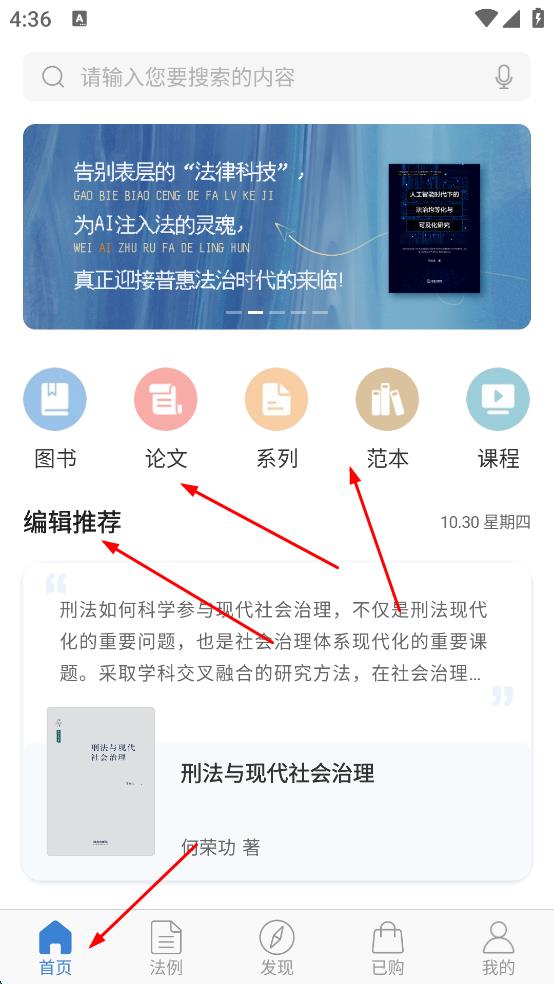1、進入APP首頁,可通過搜索查找內容,也能點擊圖書、論文等入口瀏覽,從編輯推薦里發現優質法律書籍。