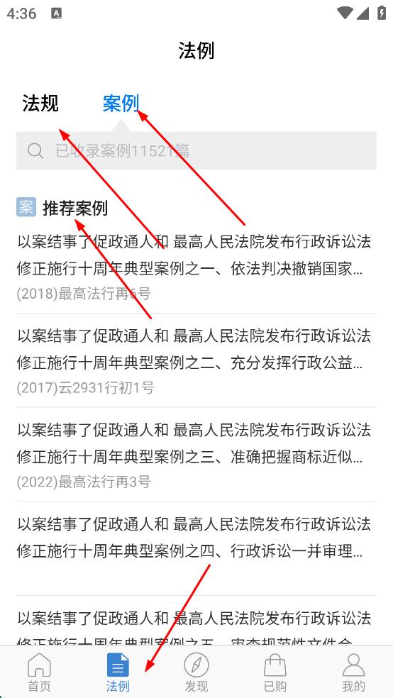 2、點擊法例界面內,切換法規、案例標簽,借助推薦案例了解行政訴訟法等典型案例,學習法律應用場景。