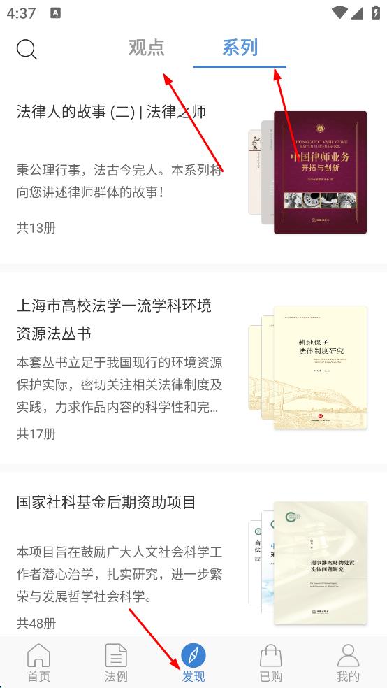 3、在發現頁面內,選擇觀點、系列板塊,查看法律人故事、環境資源法叢書等系列內容,拓展法律知識儲備。