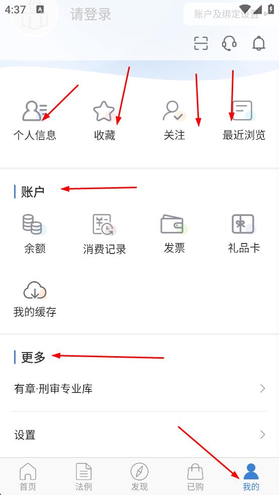 4、點擊我的欄目,可查詢個人信息、收藏、關注及最近瀏覽,管理賬戶余額、消費記錄,進入更多找專業庫與設置。