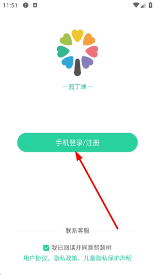 1、進入智慧樹園丁端頁面,需先勾選同意相關協議,點擊手機登錄、注冊按鈕,可通過手機號完成登錄或注冊操作,頁面還提供聯系客服入口。