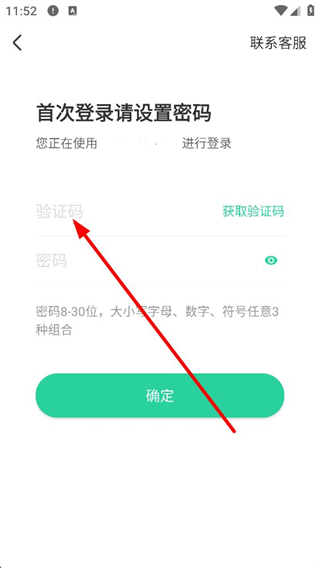 3、首次登錄需設置密碼,輸入獲取的驗證碼,再設置含大小寫字母、數字、符號任意3種組合的密碼,確認后點擊確定完成設置。