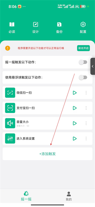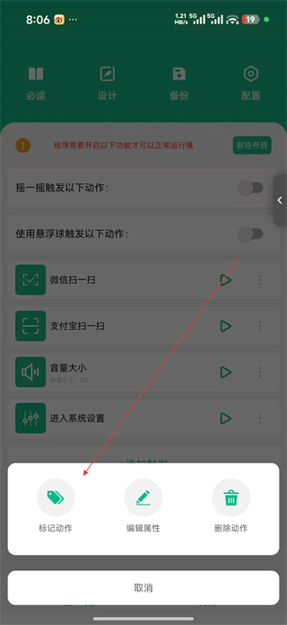 1、打開萬能搖一搖,進入主界面,查看現有觸發動作如微信掃一掃等,點擊對應動作旁的功能按鈕,可選擇標記編輯或刪除動作。