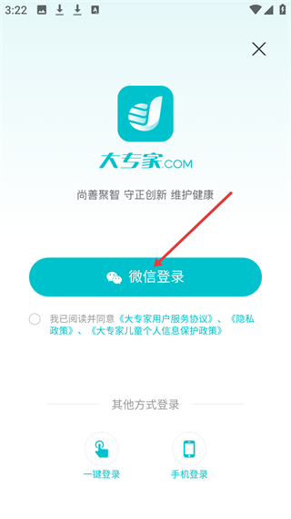 1、登錄板塊可微信、一鍵或手機登錄,需同意用戶協議,登錄方式多樣,能讓用戶便捷進入平臺,開啟醫療服務使用之旅。
