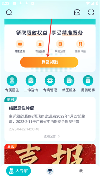 2、登頁有健康監測、風險預測等限時權益,還有專屬醫生、二診咨詢等服務,展示結腸惡性腫瘤病例,資訊豐富且實用。