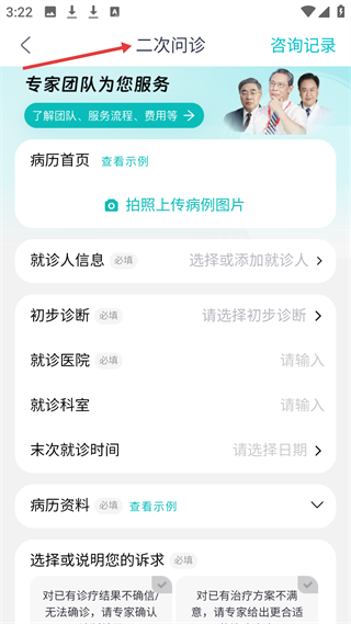4、二次問診板塊由專家團隊服務,需填寫病歷、就診人等信息,滿足用戶深度問診需求,流程規范且嚴謹。