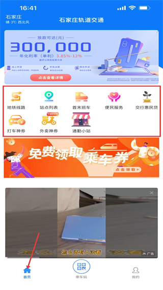 1、進入首頁可見地鐵線路站點列表首末班車等功能入口,還有打車神券外賣神券等福利,也能參與免費領取乘車券的活動,助力地鐵出行相關操作。