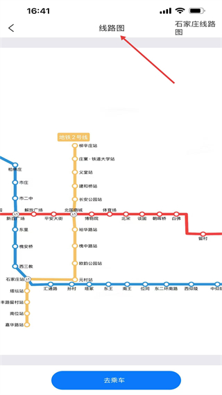 2、進入線路圖界面可查看石家莊地鐵各線路布局,清晰了解地鐵2號線等線路的站點分布,查看后可點擊去乘車按鈕進入乘車相關流程。