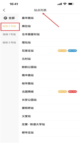 3、進入站點列表界面可選擇不同地鐵線路,選定地鐵2號線后,能查看該線路的所有站點,便于找到目標站點并查看其詳細信息。