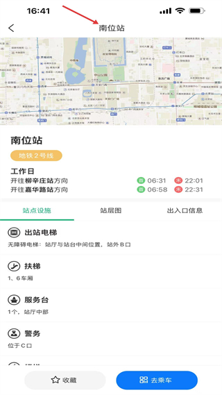 4、進入南位站詳情頁可查看該站工作日運營時間,還能了解出站電梯扶梯等設施分布,可收藏站點或點擊去乘車推進后續操作。