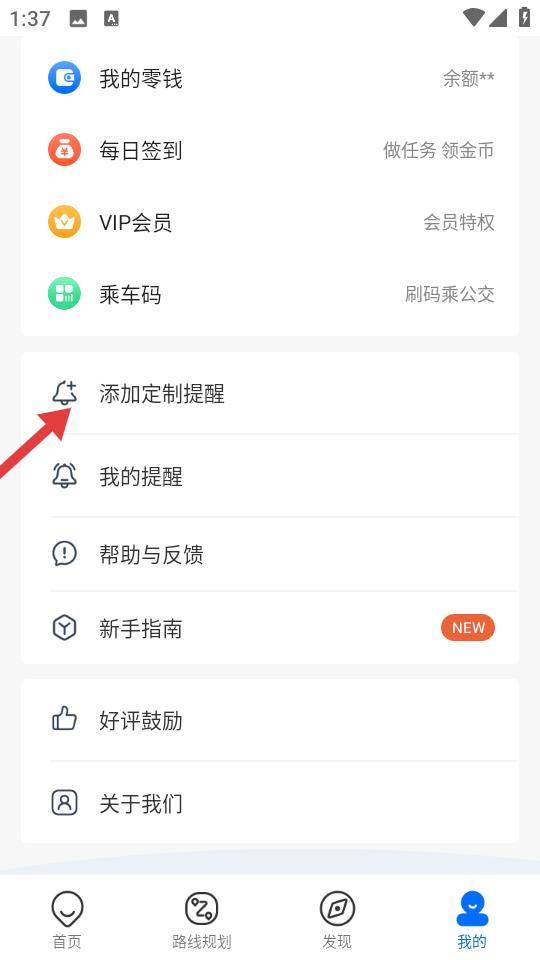 1、我的頁面羅列我的零錢等功能添加定制提醒選項顯眼,圖標為鈴鐺樣式,方便用戶點擊進入,設置個性化的出行提醒,助力規劃公交出行時間。