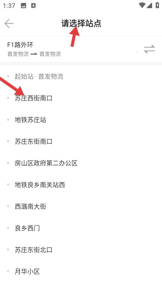 2、站點選擇頁面標題為請選擇站點展示F1路外環站點列表,蘇莊西街南口等站點清晰羅列,方便用戶挑選需要設置提醒的公交站點。